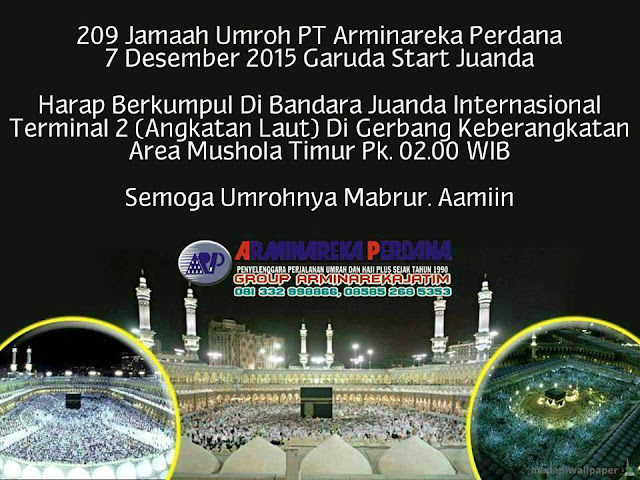 209 Jamaah Umroh PT Arminareka Perdana PT Arminareka Perdana 7 Desember 2015 Garuda Start Juanda. Harap Berkumpul Di Bandara Juanda Internasional Terminal 2 (Angkatan laut) Di Gerbang Keberangkatan Mushola Timur Pk. 02.00 WIB. Semoga Umrohnya Mabrur. Aamiin